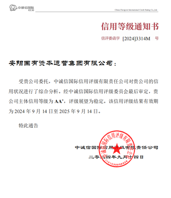 近日,經(jīng)國內(nèi)權(quán)威評級機構(gòu)中誠信國際信用評級有限責任公司(下稱“中誠信國際”)的評定,安陽國有資本運營集團有限公司(下稱“安陽國資集團”)再次獲AA+主體信用等級,評級展望為“穩(wěn)定”。 這是繼2023年4月東方金誠國際信用評估有限公司評定安陽國資集團AA+主體信用等級后,國內(nèi)又一家具有較高市場認可度的評級公司給出的AA+主體信用等級,實現(xiàn)了國資集團“雙AA+評級”,進一步增強了國資集團信用等級的公信力。